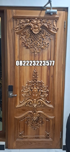 Terbuat dari kayu jati solid pilihan, pintu ini memiliki ketahanan luar biasa terhadap cuaca dan usia. Serat alami kayu jati yang berpadu dengan ukiran klasik bernuansa mewah menjadikannya bukan sekadar pintu, tetapi juga karya seni bernilai tinggi. Setiap lekuk dan motif ukir dipahat dengan teliti, menampilkan detail halus yang mencerminkan keindahan gaya klasik Eropa yang elegan.