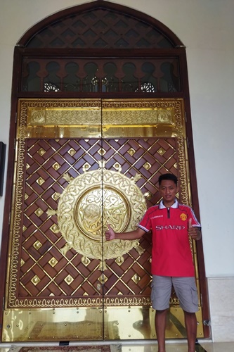 Jual pintu masjid kayu jati dengan model paling terbaru pada tahun ini yaitu model nabawi mewah. motif ini terbuat dari bahan flat kuningan sehingga kesannya sangat elegan sekali. terlihat disetiap sudutnya sangat mengkilap khas flat kuningan.