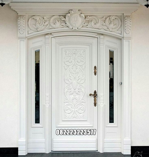 Pintu utama dengan warna putih memberikan kesan bersih, luas, dan sangat berkelas. Terlebih jika dipadukan dengan ukiran tangan khas Jepara, maka tampilan rumah menjadi sangat istimewa.
